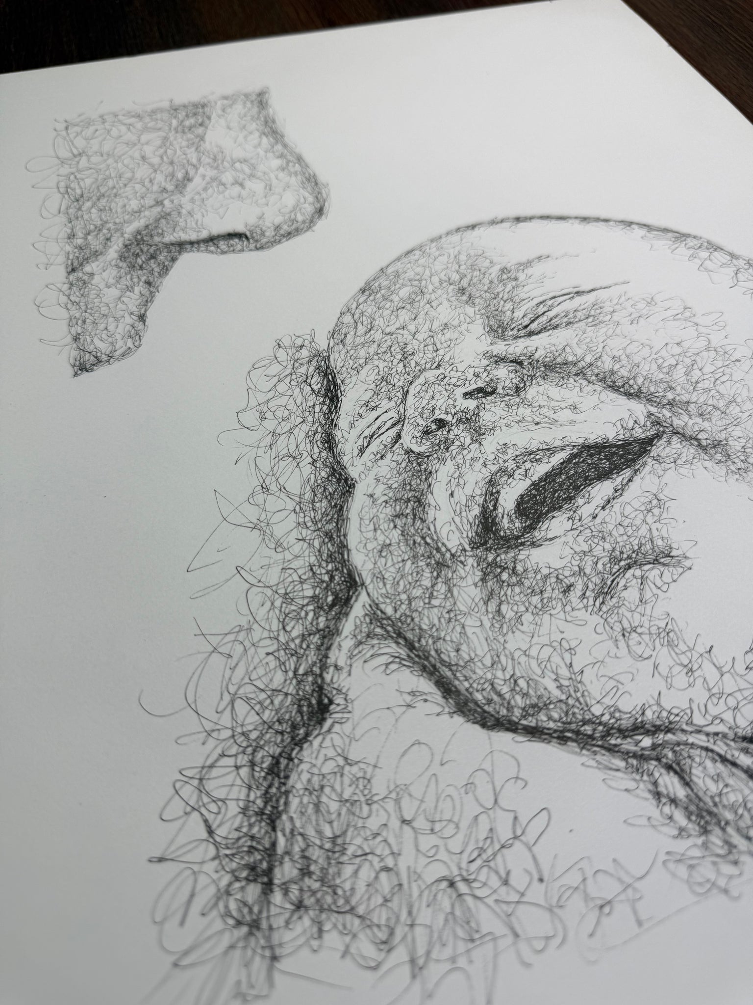 Introducing a bold new addition to my commissioned work—Scribble Portraits. These captivating pieces are created using nothing more than pen on acid-free paper, with a technique that transforms chaotic, overlapping lines into stunningly lifelike, hyper-realistic portraits.